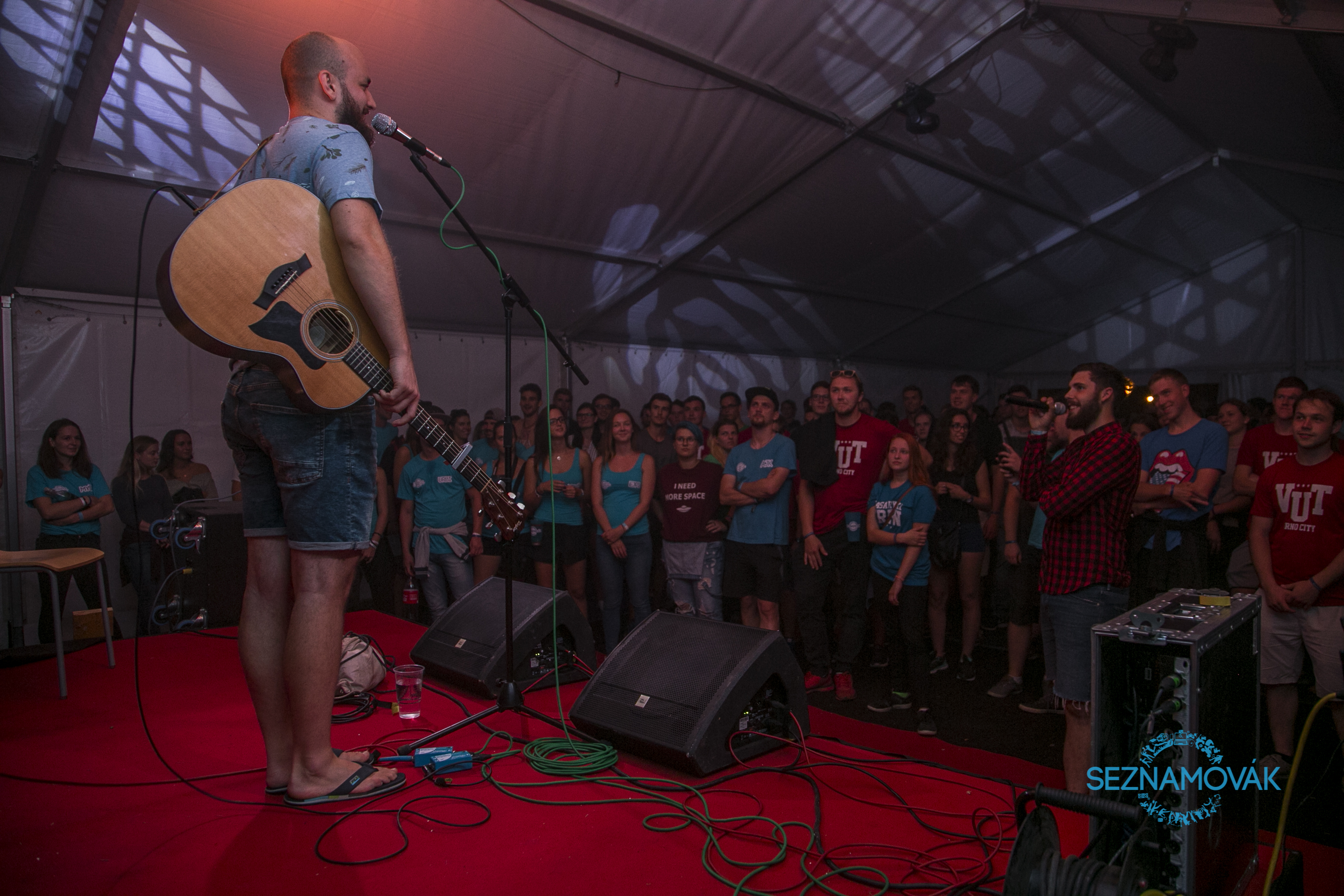 Ročník 2018 byl velice specifický. Na Seznamovák nezavítal pouze jeden host, ale hned několik. První dorazila Ostravská pop-rocková kapela Easy Steps. Jako druzí se představili Třebíčští umělci - kapela Frenciz. A třešničkou na dortu pak byl známý písničkář Pokáč, jehož koncert nadchl naprostou většinu účastníků, takže náš stan byl opravdu naplněný k prasknutí. Posluchači si vesele zpívali všechny texty a Pokáč si koncert užíval až tak, že se odhodlal ke svému prvnímu stage divingu v životě. Mimo jiné si pak taky nakonec zazpíval po jedné písničce s naší instruktorkou Lůcou a vybranou šťastnou účastnicí z publika.