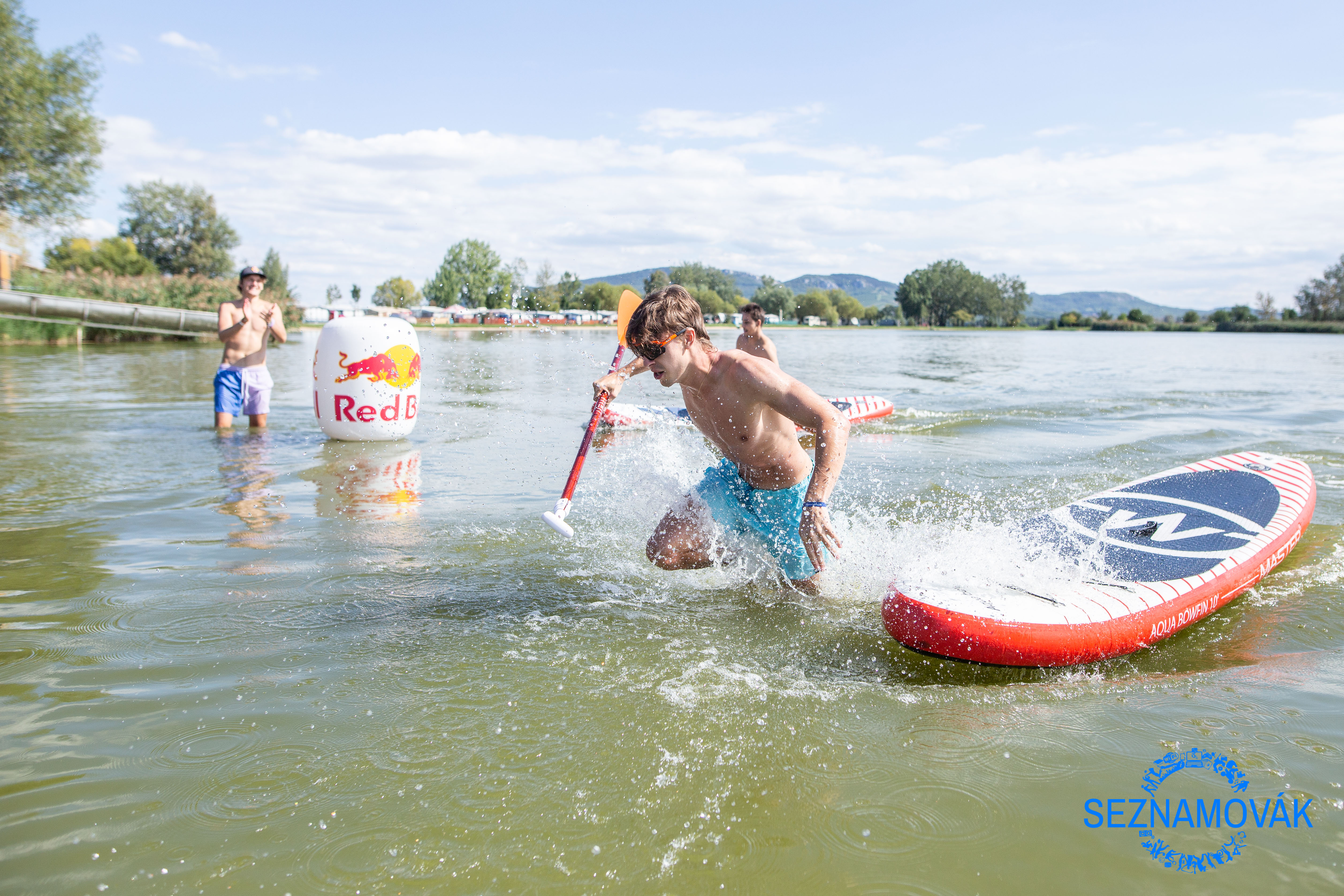 Stejně jako každý rok, tak i letos nechyběly závody od kluků z RedBullu. Tentokrát si připravili turnaj dvojic na paddleboardu. Stačilo si najít kamaráda a během dopoledne se zaregistrovat. Za registraci jsme motivačně dostali každý jednu plechovku RedBullu na nakopnutí a stačilo jen vyčkávat, než přijdeme na řadu. A o co vlastně jde? Nasednete na paddleboard, objedete bojku a vratíte se zpátky. Pak je na řadě druhý z dvojice. A abychom to neměli tak jednoduché (jako by bylo udržet se nad hladinou strašná brnkačka), na začátku každý dostane kostku cukru, která se nesmí během naší jízdy rozmočit. Pokud by se rozmočila, získává naše dvojička trestné vteřiny navíc. No a když jste dostatečně šikovní, popřípadě máte dostatečné štěstí, prokoušete se přes kvalifikační kolo a finále až k výhře - a flaška Jagera s RedBullem už míří k vám.